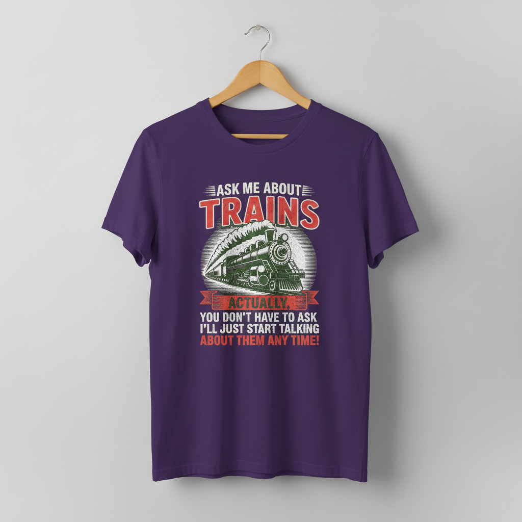This T-shirt is perfect for train enthusiasts and model train collectors. With a quirky 'Ask Me About Trains' design, this tee gives off a fun and nostalgic vibe, making it a great conversation starter at train-related events or gatherings. Ideal for adults who are passionate about trains and looking to showcase their love for this hobby.